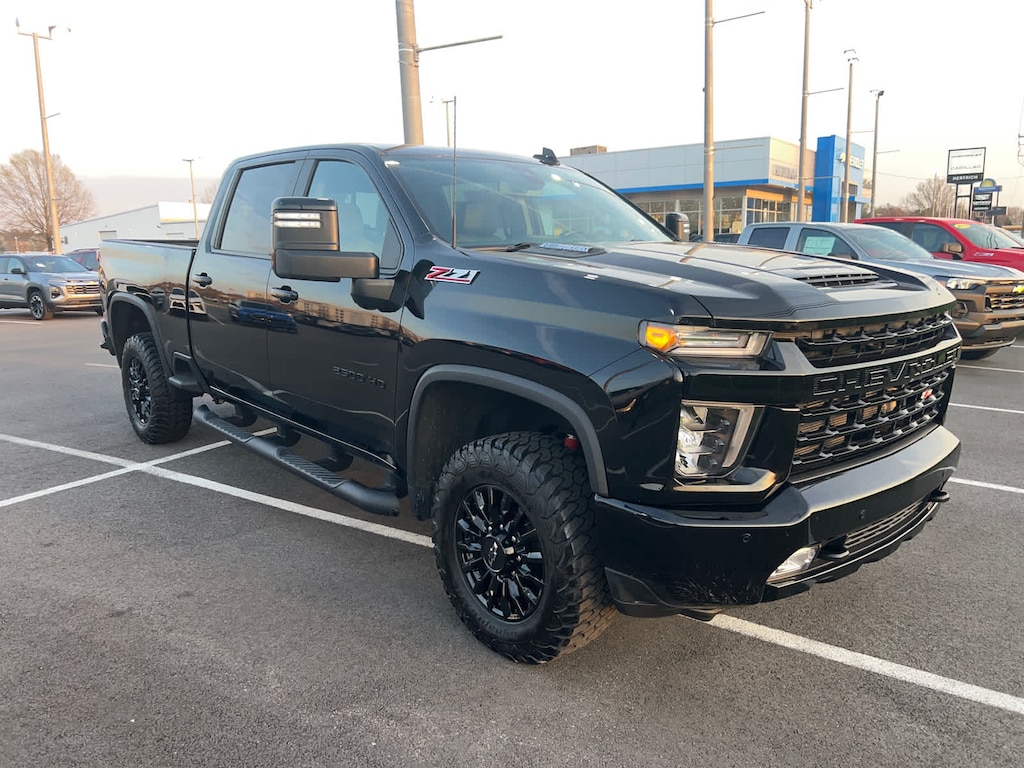 B20-Diesel compatible, (445 hp [332 kW] @ 2800 rpm, 910 lb-ft of torque [1220 Nm] @ 1600 rpm), includes Black grille bar with "CHEVROLET", Black grille inserts with Z71 badge, Black skid plate, Black Silverado, trim level and tonnage badging, Black bowtie on horn pad, (DP6) Gloss Black mirror caps, Black hood vent surround, (VB5) painted front bumper, (VT5) painted rear bumper, (CGN) Chevytec spray-on bedliner and (RVS) 4" Black assist steps, LPO Includes Black beltline moldings, (D75) painted door handles. Includes (PTW) 18" high gloss Black aluminum wheels and (QG3) LT275/70R18, mud-terrain, blackwall tires. includes (IOT) Chevrolet Infotainment System with Navigation and 8" diagonal color touch-screen, (UQA) Bose Premium Audio System, (UVN) Bed View Camera, (UVS) HD Surround Vision with Two Trailer View Camera Provisions and (K4C) Wireless Charging, includes (A50) bucket seats with (D07) center console, (KQV) heated and ventilated front seats, (A48) rear sliding power window, (UG1) Universal Home Remote, (QT6) power up/down tailgate, (UF2) bed LED cargo area lighting and (KA6) rear heated seats, includes (UD5) Front and Rear Park Assist, (UKC) Lane Change Alert with Side Blind Zone Alert and (UFG) Rear Cross Traffic Alert (Beginning with start of production, vehicles may be forced to include (00Z) Not Equipped with Front and Rear Park Assist, which removes Front and Rear Park Assist. See dealer for details or the window label for the features on a specific vehicle. includes (UEU) Forward Collision Alert, (UFL) Lane Departure Warning, (UHY) Automatic Emergency Braking, (TQ5) IntelliBeam headlamps, (UE4) Following Distance Indicator and (HS1) Safety Alert Seat, with six functional load/access features, NOTE: Auto release can be disabled if ball hitch is installed. See Owner's manual for details, 8" diagonal HD color touchscreen, AM/FM stereo, Bluetooth® audio streaming for 2 active devices, wireless Apple CarPlay® and Android Auto® capable, enhanced voice recognition, additional memory for in-vehicle apps, cloud connected personalization for select infotainment and vehicle settings. Subscription required for enhanced and connected services after trial period. Includes (PZ8) High Guidance with Hitch View.), TRANSMISSION, ALLISON 10-SPEED AUTOMATIC. Chevrolet LTZ with Black exterior and Jet Black interior features a 8 Cylinder Engine with 401 HP at 5200 RPM*.